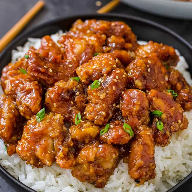 General Tso's Chicken is a popular Chinese-American dish that is known for its sweet and spicy flavor. It typically consists of chicken pieces that are breaded and fried until crispy, then tossed in a sweet and savory sauce made with ingredients like soy sauce, hoisin sauce, vinegar, garlic, and ginger. Here is a simple recipe that you can follow to make this dish at home: